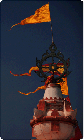 The Nila Chakra (Blue Discus) is the discus mounted on the top shikhar of the Puri Temple at Puri. As per custom, everyday a different flag is waved on the Nila Chakra. The flag hoisted on the Nila Cakra is called the Patita Pavana (Purifier of the Fallen) and is equivalent to the image of the deities placed in the sanctum sanctorum, The Nila Chakra is a disc with eight Navagunjaras carved on the outer circumference, with all facing towards the flagpost above. The Nila Chakra on Puri Temple is made of alloy of eight metals (Asta-dhatu) and is 3.5 Metres (11 feet and 8 inches) high with a circumference of about 11 metres (36 feet). The Nila Chakra is distinct from the Sudarshana chakra which has been placed with the deities in the inner sanctorum.
